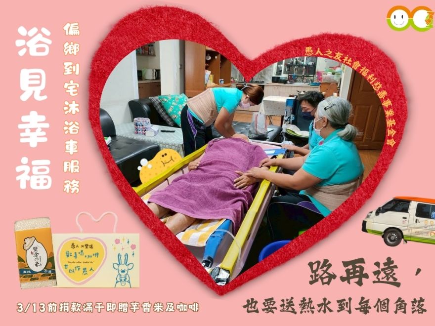 為了讓行動不便的長輩與身障朋友,在家中也能安心、尊嚴地完成沐浴,本會推出 「到宅沐浴車」愛心捐款回饋活動,邀請您一起用行動支持偏鄉照顧服務。