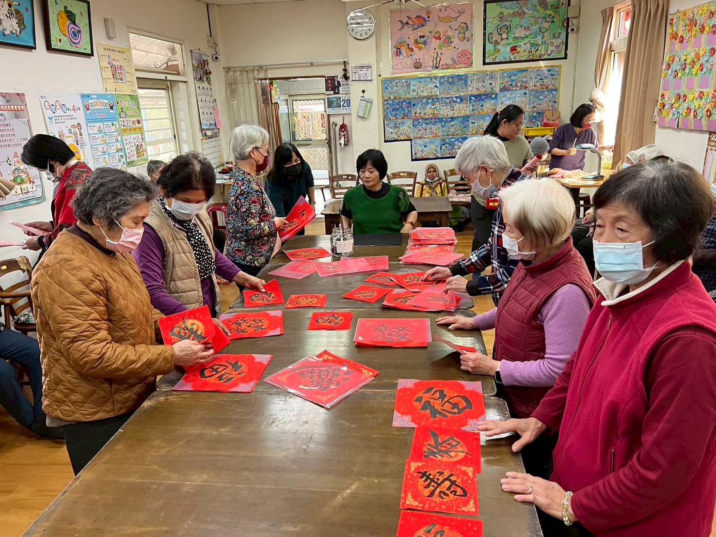 接著,書法老師陳奕廷依照長輩們的需求揮毫寫春聯,紅紙墨香,年味十足。